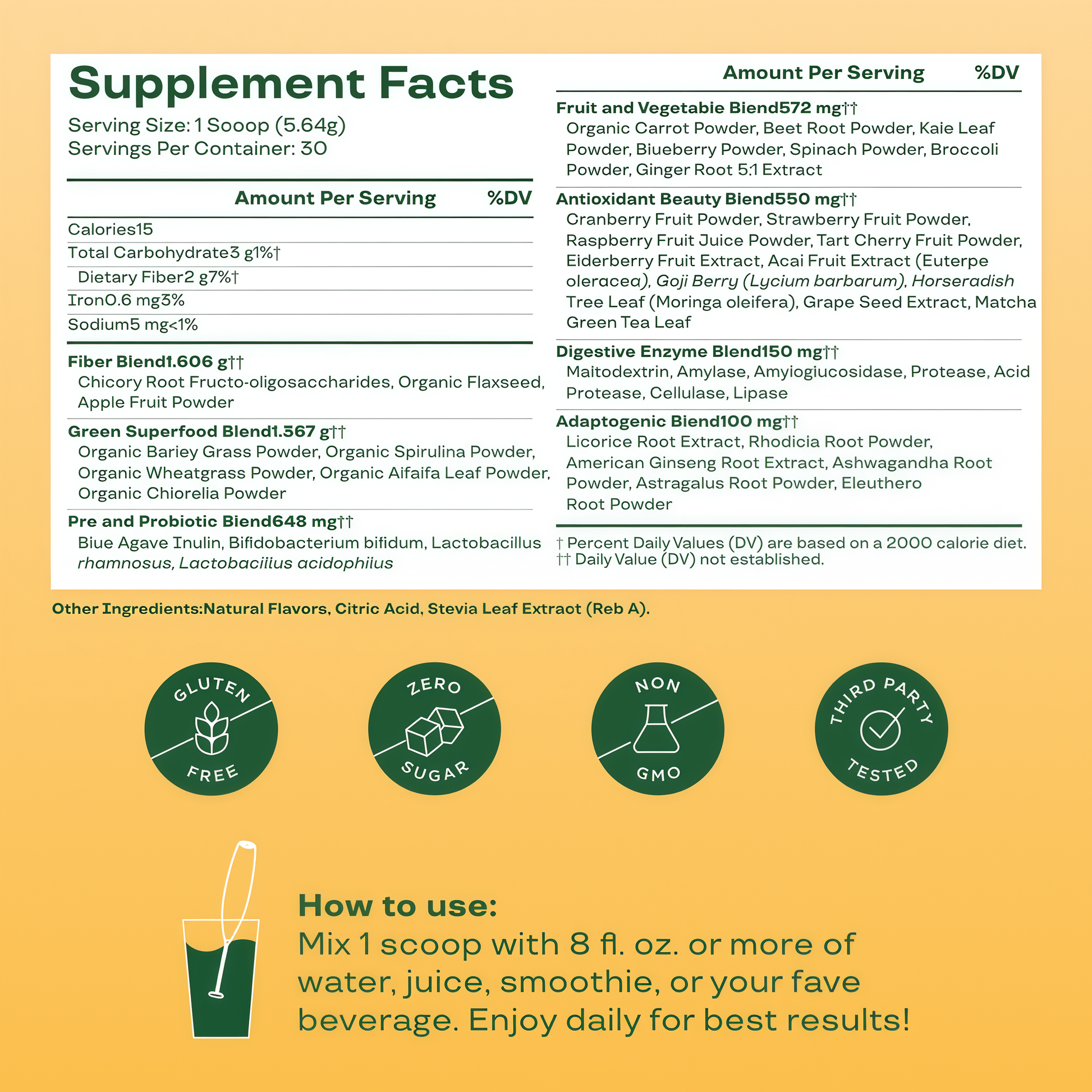 Our blend features 38 gut-healthy ingredients. This includes fruits and veggies, enhanced prebiotics and probiotics, digestive enzymes, fiber, and antioxidants.